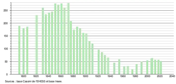 L'évolution du nombre d'habitants est connue à travers les recensements de la population effectués dans la commune depuis 1793. Pour les communes de moins de 10 000 habitants, une enquête de recensement portant sur toute la population est réalisée tous les cinq ans, les populations légales des années intermédiaires étant quant à elles estimées par interpolation ou extrapolation[27]. Pour la commune, le premier recensement exhaustif entrant dans le cadre du nouveau dispositif a été réalisé en 2007[28].