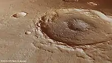 Une vue en perspective d'un cratère de 50 km de diamètre à Thaumasia Planum. L'image a été réalisée en combinant les données de la caméra stéréo haute résolution sur Mars Express de l'ESA avec des modèles numériques de terrain. L'image a été prise le 4 janvier 2013, pendant l'orbite 11467, et montre une vue rapprochée de la "fosse" centrale de ce cratère, qui s'est probablement formée par une explosion souterraine alors que la chaleur de l'impact a rapidement vaporisé de l'eau ou de la glace se trouvant en dessous de la surface.
