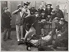 Photo promotionnelle de The Female Cop, une comédie split reel sortie le 6 juin 1914 par la Lubin Film Manufacturing Company avec un casting comprenant Mae Hotely (centre) et Oliver « Babe » Hardy (arrière gauche).