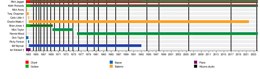 Brian Jones meurt noyé dans sa piscine en , peu de temps après sa mise à pied du groupe. Il est remplacé par Mick Taylor qui participe aux tournées et à l'enregistrement de cinq albums studio avant de quitter les Stones en 1974. L'ancien guitariste des Faces, Ronnie Wood, prend alors sa place, qu'il conserve depuis lors. Bill Wyman quitte à son tour le groupe en 1993. Le bassiste Darryl Jones le remplace, sans en devenir un membre officiel.