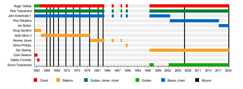 Durant les douze premières années de leur carrière discographique — entre 1965 et 1978 —, ils publient neuf albums et près d'une quinzaine de singles originaux[2], jusqu'à la mort du batteur Keith Moon. Après le décès de ce dernier, le groupe publie encore deux albums avec le batteur Kenney Jones avant de se séparer en 1983. Les Who se réunissent à la fin des années 1980, puis en 1996 pour ne plus se séparer, malgré la mort du bassiste John Entwistle en 2002. Dès lors, Pete Townshend et Roger Daltrey continuent en duo, se produisant dans le monde entier, accompagnés de musiciens comme Pino Palladino (basse) et Zak Starkey (batterie). Leur douzième album studio est sorti en .