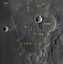 Par convention, les cratères satellites sont identifiés sur les cartes lunaires en plaçant la lettre sur le côté du point central du cratère qui est le plus proche de Thebit.