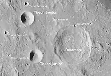 - (en) Cet article est partiellement ou en totalité issu de l’article de Wikipédia en anglais intitulé « Theon Junior (crater) » (voir la liste des auteurs).