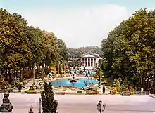 Les jardins de l’établissement, avec leur kiosque à musique et leurs étangs, s'ouvrent derrière les thermes (donc en direction de l'est).