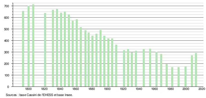 L'évolution du nombre d'habitants est connue à travers les recensements de la population effectués dans la commune depuis 1793. À partir du , les populations légales des communes sont publiées annuellement dans le cadre d'un recensement qui repose désormais sur une collecte d'information annuelle, concernant successivement tous les territoires communaux au cours d'une période de cinq ans. Pour les communes de moins de 10 000 habitants, une enquête de recensement portant sur toute la population est réalisée tous les cinq ans, les populations légales des années intermédiaires étant quant à elles estimées par interpolation ou extrapolation[5]. Pour la commune, le premier recensement exhaustif entrant dans le cadre du nouveau dispositif a été réalisé en 2007[6],[Note 1].