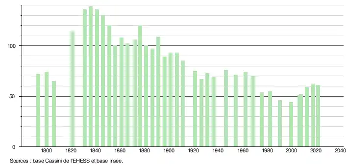 L'évolution du nombre d'habitants est connue à travers les recensements de la population effectués dans la commune depuis 1793. Pour les communes de moins de 10 000 habitants, une enquête de recensement portant sur toute la population est réalisée tous les cinq ans, les populations légales des années intermédiaires étant quant à elles estimées par interpolation ou extrapolation[17]. Pour la commune, le premier recensement exhaustif entrant dans le cadre du nouveau dispositif a été réalisé en 2007[18].