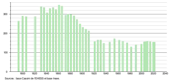 L'évolution du nombre d'habitants est connue à travers les recensements de la population effectués dans la commune depuis 1793. Pour les communes de moins de 10 000 habitants, une enquête de recensement portant sur toute la population est réalisée tous les cinq ans, les populations légales des années intermédiaires étant quant à elles estimées par interpolation ou extrapolation[17]. Pour la commune, le premier recensement exhaustif entrant dans le cadre du nouveau dispositif a été réalisé en 2004[18].