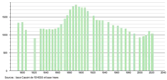 L'évolution du nombre d'habitants est connue à travers les recensements de la population effectués dans la commune depuis 1793. Pour les communes de moins de 10 000 habitants, une enquête de recensement portant sur toute la population est réalisée tous les cinq ans, les populations légales des années intermédiaires étant quant à elles estimées par interpolation ou extrapolation[22]. Pour la commune, le premier recensement exhaustif entrant dans le cadre du nouveau dispositif a été réalisé en 2005[23].