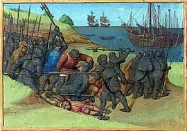 En 515, les Danois envahissent la Gaule et ravagent une partie du royaume de Thierry tout en faisant les habitants prisonniers. Après avoir rempli leurs navires pour rentrer chez eux, les Danois mettent toutes voiles dehors. Comptant s'embarquer en dernier, Chlochilaïc, roi des Danois, est attaqué par Thibert que Thierry, ayant été averti que des étrangers pillent son royaume, a envoyé pour combattre les envahisseurs. Grâce à une puissante armée, les Francs tuent le roi Chlochilaïc, et récupèrent tout le butin volé par les Danois après une bataille navale[20]. Le royaume de Thierry étant peu maritime, il se peut qu'il n'ait pas eu de flotte, et qu'il s'agisse d'une formulation pour expliquer que les troupes combattaient des marins[21]. Au VIIIe siècle, des récits racontent comment le géant danois Hygelac périt au combat. Une légende affirme que ses os étaient encore visibles dans une île des bouches du Rhin[22].