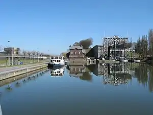 Ancienne section du canal du Centre à Thieu (au loin, la superstructure de l'ascenseur n° 4 domine le village) | |||||