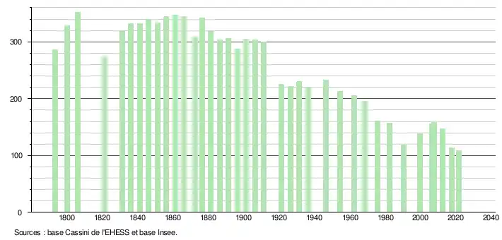 L'évolution du nombre d'habitants est connue à travers les recensements de la population effectués dans la commune depuis 1793. Pour les communes de moins de 10 000 habitants, une enquête de recensement portant sur toute la population est réalisée tous les cinq ans, les populations légales des années intermédiaires étant quant à elles estimées par interpolation ou extrapolation[17]. Pour la commune, le premier recensement exhaustif entrant dans le cadre du nouveau dispositif a été réalisé en 2007[18].