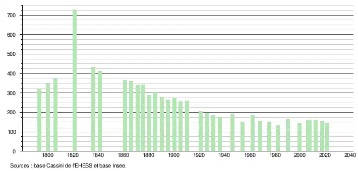 L'évolution du nombre d'habitants est connue à travers les recensements de la population effectués dans la commune depuis 1793. Pour les communes de moins de 10 000 habitants, une enquête de recensement portant sur toute la population est réalisée tous les cinq ans, les populations légales des années intermédiaires étant quant à elles estimées par interpolation ou extrapolation[15]. Pour la commune, le premier recensement exhaustif entrant dans le cadre du nouveau dispositif a été réalisé en 2007[16].
