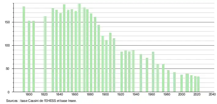 L'évolution du nombre d'habitants est connue à travers les recensements de la population effectués dans la commune depuis 1793. Pour les communes de moins de 10 000 habitants, une enquête de recensement portant sur toute la population est réalisée tous les cinq ans, les populations légales des années intermédiaires étant quant à elles estimées par interpolation ou extrapolation[14]. Pour la commune, le premier recensement exhaustif entrant dans le cadre du nouveau dispositif a été réalisé en 2007[15].