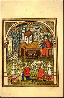 Quatre anciens maîtres de l'alchimie (Geber, Arnaud de Villeneuve, Razi et Hermès) présidant au Grand Œuvre