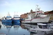 - La madrague rentrante (1 355 tonnes en 1992) piège les thons en mai et juin, à l'entrée du détroit de Gibraltar, au moment où ces poissons gagnent la Méditerranée pour frayer. On en dénombre quatre espagnoles (1 271 tonnes) et trois marocaines (84 tonnes).