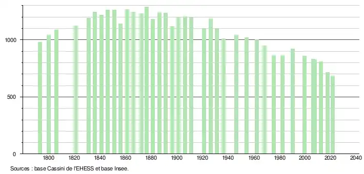 L'évolution du nombre d'habitants est connue à travers les recensements de la population effectués dans la commune depuis 1793. Pour les communes de moins de 10 000 habitants, une enquête de recensement portant sur toute la population est réalisée tous les cinq ans, les populations légales des années intermédiaires étant quant à elles estimées par interpolation ou extrapolation[17]. Pour la commune, le premier recensement exhaustif entrant dans le cadre du nouveau dispositif a été réalisé en 2007[18].