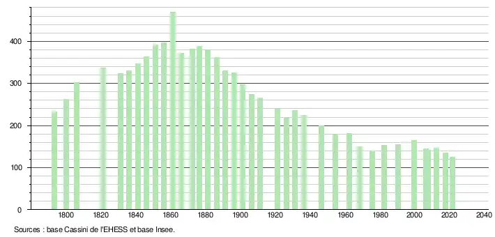 L'évolution du nombre d'habitants est connue à travers les recensements de la population effectués dans la commune depuis 1793. Pour les communes de moins de 10 000 habitants, une enquête de recensement portant sur toute la population est réalisée tous les cinq ans, les populations légales des années intermédiaires étant quant à elles estimées par interpolation ou extrapolation[15]. Pour la commune, le premier recensement exhaustif entrant dans le cadre du nouveau dispositif a été réalisé en 2007[16].