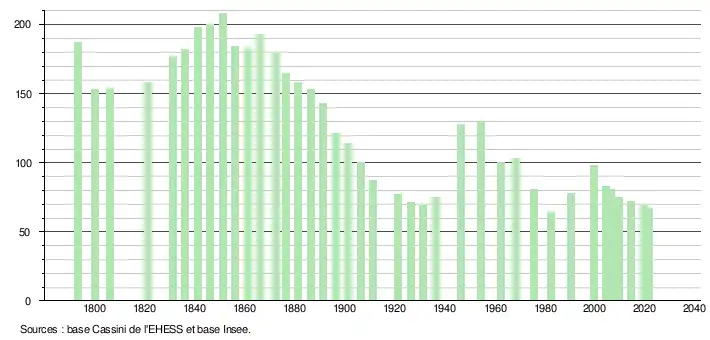 L'évolution du nombre d'habitants est connue à travers les recensements de la population effectués dans la commune depuis 1793. Pour les communes de moins de 10 000 habitants, une enquête de recensement portant sur toute la population est réalisée tous les cinq ans, les populations légales des années intermédiaires étant quant à elles estimées par interpolation ou extrapolation[17]. Pour la commune, le premier recensement exhaustif entrant dans le cadre du nouveau dispositif a été réalisé en 2004[18].