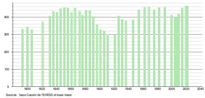 L'évolution du nombre d'habitants est connue à travers les recensements de la population effectués dans la commune depuis 1793. Pour les communes de moins de 10 000 habitants, une enquête de recensement portant sur toute la population est réalisée tous les cinq ans, les populations légales des années intermédiaires étant quant à elles estimées par interpolation ou extrapolation[20]. Pour la commune, le premier recensement exhaustif entrant dans le cadre du nouveau dispositif a été réalisé en 2004[21].