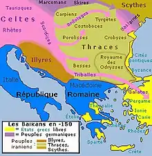 Durant les guerres mithridatiques de 88 à 63, les Thraces fournissent des troupes à Mithridate VI. Par la suite, les Romains interviennent plusieurs fois dans le royaume des Odryses, notamment sous Octave Auguste et Tibère. La Mésie est définitivement conquise par le petit-fils de Crassus en 29 av. J.-C. et transformée en province romaine en 6 av. J.-C. Après diverses querelles entre tribus et guerres de succession, sachant que les dynastes thraces se partagent alors entre clients des Romains et alliés des Daces, le royaume des Odryses est annexé par Claude et transformé en province de Thrace en 46 apr. J.-C. avec Périnthe pour capitale[18]. Entre 101 et 106, l'empereur Trajan mène deux guerres daciques qui aboutissent à l'annexion du royaume dace et à la création de la province de Dacie. La romanisation des Thraces les transforme en Valaques. Byzance, une colonie grecque de Thrace dont le nom est peut-être d'origine thrace, est choisie pour devenir la capitale de l'Empire romain d'Orient sous le nom de Constantinople en 330.