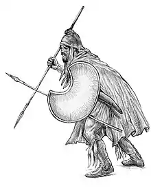 Les Thraces évitent traditionnellement les armures et les jambières pour conserver leur mobilité ; mais des armures en métal commencent à apparaître au IVe siècle av. J.-C. parmi la noblesse[24]. Des armures en écailles de type scythe sont également parfois utilisées. Le casque thrace, appelé aussi phrygien du fait de sa forme ressemblant à une bonnet, est adopté par les phalangites macédoniens. Durant l'époque hellénistique, les guerriers thraces adoptent le bouclier long, le thuréos[25], inspiré des Celtes et qui se répand ensuite à leur contact dans les armées lagides et séleucides. Enfin, les Thraces utilisent des équipements grecs de différentes périodes et portent parfois des armures qui ont cessé d'être utilisées ailleurs[26]. Plus tard, ils adoptent les armements romains[27]. Les guerriers thraces décorent leur corps de tatouages comme les Illyriens et les Gètes.