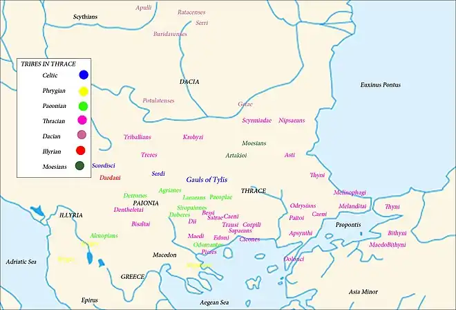 Près de 130 tribus thraces sont recensées[5], bien que leur appartenance ethnique ne soit pas toujours bien établie. Parmi les principales on peut citer :