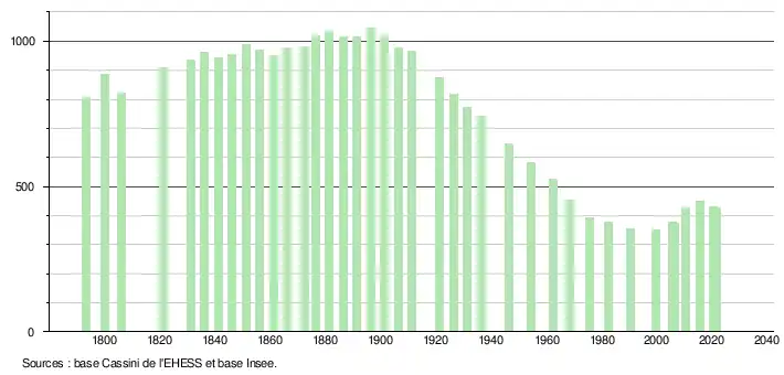 L'évolution du nombre d'habitants est connue à travers les recensements de la population effectués dans la commune depuis 1793. Pour les communes de moins de 10 000 habitants, une enquête de recensement portant sur toute la population est réalisée tous les cinq ans, les populations légales des années intermédiaires étant quant à elles estimées par interpolation ou extrapolation[16]. Pour la commune, le premier recensement exhaustif entrant dans le cadre du nouveau dispositif a été réalisé en 2005[17].