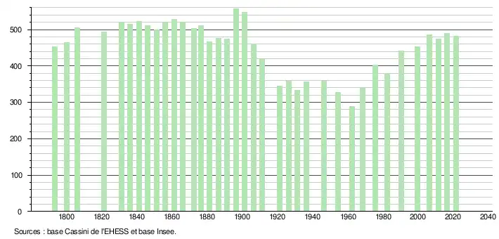 L'évolution du nombre d'habitants est connue à travers les recensements de la population effectués dans la commune depuis 1793. Pour les communes de moins de 10 000 habitants, une enquête de recensement portant sur toute la population est réalisée tous les cinq ans, les populations légales des années intermédiaires étant quant à elles estimées par interpolation ou extrapolation[17]. Pour la commune, le premier recensement exhaustif entrant dans le cadre du nouveau dispositif a été réalisé en 2006[18].