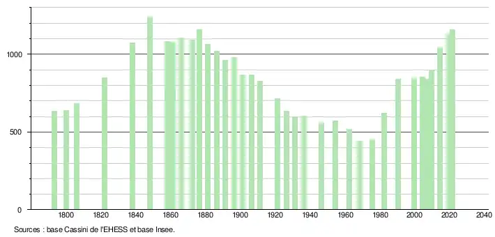 L'évolution du nombre d'habitants est connue à travers les recensements de la population effectués dans la commune depuis 1793. Pour les communes de moins de 10 000 habitants, une enquête de recensement portant sur toute la population est réalisée tous les cinq ans, les populations légales des années intermédiaires étant quant à elles estimées par interpolation ou extrapolation[14]. Pour la commune, le premier recensement exhaustif entrant dans le cadre du nouveau dispositif a été réalisé en 2004[15].