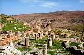 Les ruines se diviseraient en trois zones : le premier occupant le plateau, le second, le versant oriental, le troisième, le pied de la falaise. Le plateau est divisé en deux parties séparées par un mur partant du point le plus élevé appelé Ras El Dar. Seule la partie orientale du plateau a été construite[4]. Schématiquement, plus l'on monte, plus l'on trouve des quartiers plus anciens de la ville[2].