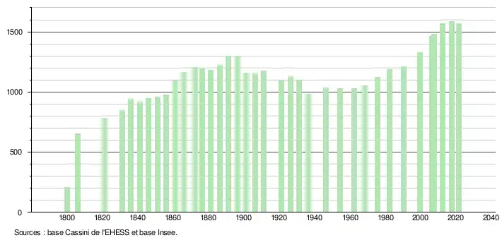 L'évolution du nombre d'habitants est connue à travers les recensements de la population effectués dans la commune depuis 1800. Pour les communes de moins de 10 000 habitants, une enquête de recensement portant sur toute la population est réalisée tous les cinq ans, les populations légales des années intermédiaires étant quant à elles estimées par interpolation ou extrapolation[21]. Pour la commune, le premier recensement exhaustif entrant dans le cadre du nouveau dispositif a été réalisé en 2007[22].