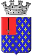 D'azur semé de fleurs de lys d'or, au franc-quartier brochant de gueules chargé d'une épée d'argent (al. de sable) au pommeau de sable (al. d'argent). |