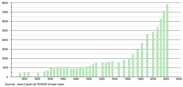 L'évolution du nombre d'habitants est connue à travers les recensements de la population effectués dans la commune depuis 1793. Pour les communes de moins de 10 000 habitants, une enquête de recensement portant sur toute la population est réalisée tous les cinq ans, les populations légales des années intermédiaires étant quant à elles estimées par interpolation ou extrapolation[29]. Pour la commune, le premier recensement exhaustif entrant dans le cadre du nouveau dispositif a été réalisé en 2006[30].