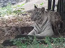 Un tigre blanc accompagné de ses petits au parc zoologique d'Arignar Anna, en Inde. Le tigreau de gauche possède des rayures anormalement larges, lui donnant presque une fourrure noire. Il est vraisemblablement atteint de pseudo-mélanisme.