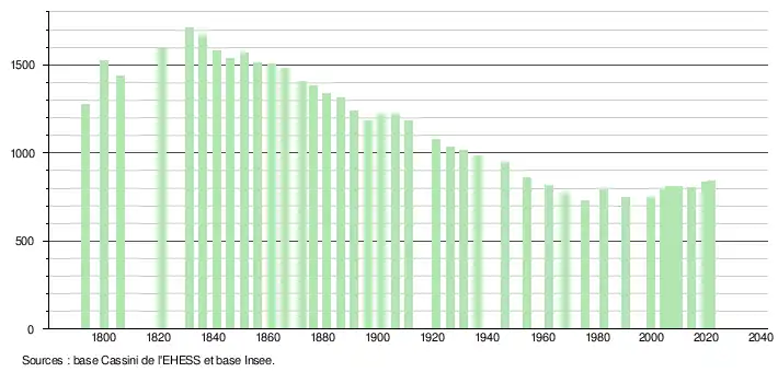 | L'évolution du nombre d'habitants est connue à travers les recensements de la population effectués dans la commune depuis 1793. Pour les communes de moins de 10 000 habitants, une enquête de recensement portant sur toute la population est réalisée tous les cinq ans, les populations légales des années intermédiaires étant quant à elles estimées par interpolation ou extrapolation[22]. Pour la commune, le premier recensement exhaustif entrant dans le cadre du nouveau dispositif a été réalisé en 2004[23]. En 2021, la commune comptait 842 habitants[Note 2], en augmentation de 5,38 % par rapport à 2015 (Landes : +4,9 %, France hors Mayotte : +1,84 %). |