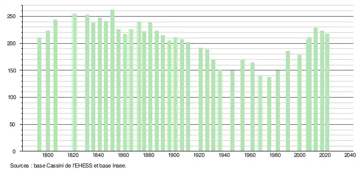 L'évolution du nombre d'habitants est connue à travers les recensements de la population effectués dans la commune depuis 1793. Pour les communes de moins de 10 000 habitants, une enquête de recensement portant sur toute la population est réalisée tous les cinq ans, les populations légales des années intermédiaires étant quant à elles estimées par interpolation ou extrapolation[29]. Pour la commune, le premier recensement exhaustif entrant dans le cadre du nouveau dispositif a été réalisé en 2007[30].