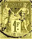 - Le un franc vermillon, plus grosse valeur faciale émise alors, qui connut plusieurs variations de couleurs, servait à affranchir des envois plus importants. Beaucoup plus rare que le précédent, il est très connu des philatélistes pour sa valeur marchande très élevée.