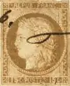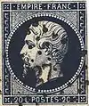 ![]() Napoléon III, type Empire franc. 20 c. bleu (1853) ![]() ![]() Type Mouchon 20 c. brun-lilas (1902) |