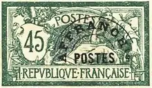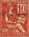 ![]() Napoléon III, type Empire franc. 5 c. vert (1853) ![]() Cérès, émission de Bordeaux, 10 c. bistre (1870) ![]() Type Mouchon 10 c. rose (1900) ![]() Type Merson 3 f. rose (1900) |