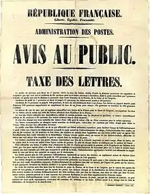 Le décret du 24 août 1848 fixe les nouvelles tarifications et modalités de taxation des courriers, notamment l'apparition de trois timbres dans son article 5.