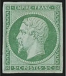 Le , est émis un timbre non dentelé de 5 centimes de couleur verte sur papier vert pâle (vert clair à vert bleuté) représentant l'empereur Napoléon III et légendé « EMPIRE FRANC ». Il permet désormais l'affranchissement d'imprimés d'un certain poids, qui peuvent donc être déposés dans une boîte aux lettres[4].
