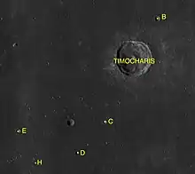 Par convention, les cratères satellites sont identifiés sur les cartes lunaires en plaçant la lettre sur le côté du point central du cratère qui est le plus proche du centre du cratère principal de Timocharis.