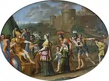 Timoclée est saisie par les soldats thraces et conduite devant Alexandre, liée et garrotée. Avec une grande dignité elle se présente, reconnait le meurtre mais revendique son bon droit de s'être vengée de l'homme qui lui avait fait violence. Admiratif, Alexandre la libère, avec ses enfants[1].