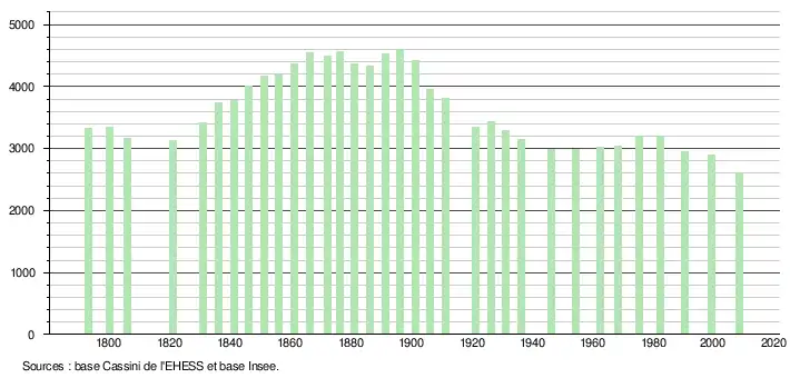 - Dans le tableau des recensements et le graphique, par convention dans Wikipédia, le principe a été retenu, pour les populations légales postérieures à 1999 de n’afficher dans le tableau des recensements et le graphique que les populations correspondant à l'année 2006, première population légale publiée calculée conformément aux concepts définis dans le décret no 2003-485 du 5 juin 2003, et les années correspondant à une enquête exhaustive de recensement pour les communes de moins de 10 000 habitants, ainsi que la dernière population légale publiée par l’Insee.
