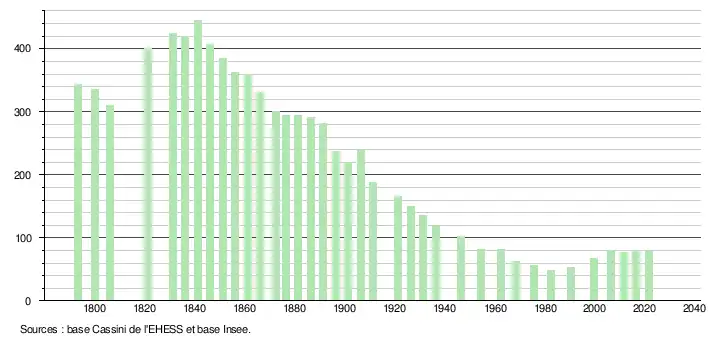 L'évolution du nombre d'habitants est connue à travers les recensements de la population effectués dans la commune depuis 1793. Pour les communes de moins de 10 000 habitants, une enquête de recensement portant sur toute la population est réalisée tous les cinq ans, les populations légales des années intermédiaires étant quant à elles estimées par interpolation ou extrapolation[14]. Pour la commune, le premier recensement exhaustif entrant dans le cadre du nouveau dispositif a été réalisé en 2006[15].