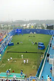 Les compétitions de tir à l'arc ont eu lieu au centre de tir à l'arc du Parc olympique de Pékin, à 800 mètres du village olympique. Le centre de tir était une installation spécifique pour les Jeux de Pékin. Ce terrain était composé de deux champs de tir, le champ A pouvant accueillir 4500 personnes, alors que le champ B ne peut en accueillir que 800.