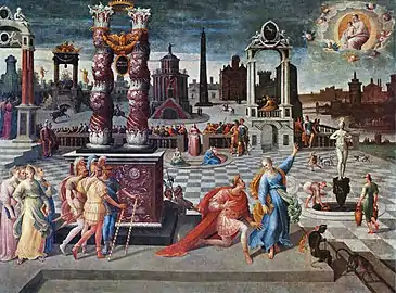 Du temps des Étrusques au IIe siècle av. J.-C., la ville des Sabins abrite deux importants temples tous deux situés au-dessus des spectaculaires chutes naturelles : le temple de la Sibylle, monument le plus ancien de la ville où le nom de Tiburtus apparaît sur le fronton[13], dédié à une nymphe des eaux appelée Albunéa par Varron qui fut la dixième à s'échouer sur les rives de l'Aniene, et le temple de Vesta construit au siècle suivant. À cette époque, Tibur est considérée par les historiens comme un « sanctuaire prophétique » en raison de son site d'établissement près des chutes d'eau sonores, des grottes du val dell'Inferno « habitées par des voix », et des sources thermales aux vapeurs infernales qui font du site un « lieu de transmission de la parole de la terre[14] ». Ainsi l'empereur Auguste, en quête d'oracle, fait venir la Sibylle de Tibur à Rome qui lui aurait prophétisé, sur le lieu de l'actuelle basilique Sainte-Marie d'Aracœli selon la tradition médiévale, la venue du Christ[note 2] sur le Capitole[15]. Cette période est marquée par une intense activité urbanistique et la construction du Temple d'Hercule vainqueur.