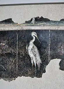 Détail d'une peinture murale, datée du Ier siècle, provenant du péristyle d'une maison gallo-romaine, découverte en 1977 rue du à Vienne (France) : l’un des échassiers représentés sur la plinthe. Site et musée de Saint-Romain-en-Gal.