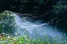 Chez les Araignées orbitèles du genre pantropical Cyrtophora, la toile est entièrement dépourvue de soie collante sur sa spirale en dôme car l’appareil séricigène ne comporte pas les glandes agrégées qui produisent la glue[13]. Les mailles du dôme sur lequel les proies sont rabattues par des fils tenseurs sont très petites et de forme carrée caractéristique.
