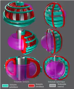 Le schéma 4 souligne les différences de configuration des aimants entre tokamak torique et tokamak sphérique notamment :